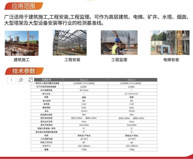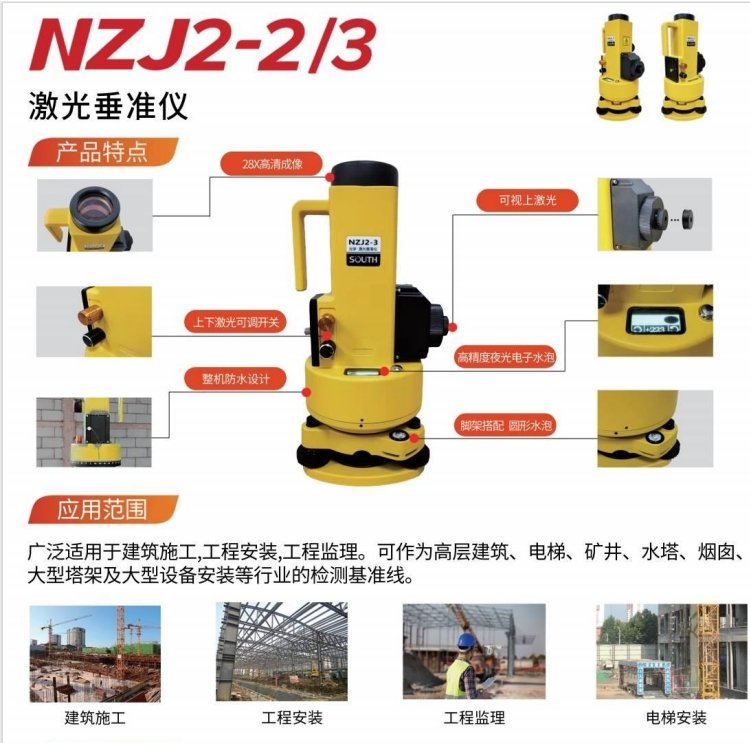 DZJ-300A可廣泛應用于建筑施工、工程安裝、工程監理、變形觀測。如:高層建筑、電梯、礦井、水塔、煙囪、大型設備安裝、飛機制造、造船等行業。   性能特點: ...